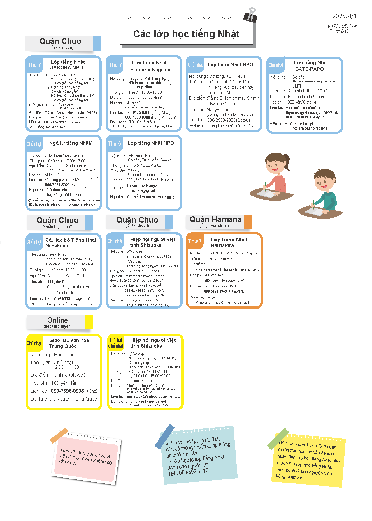 Về các lớp học tiếng Nhật, xin hãy liên hệ với chúng tôi.