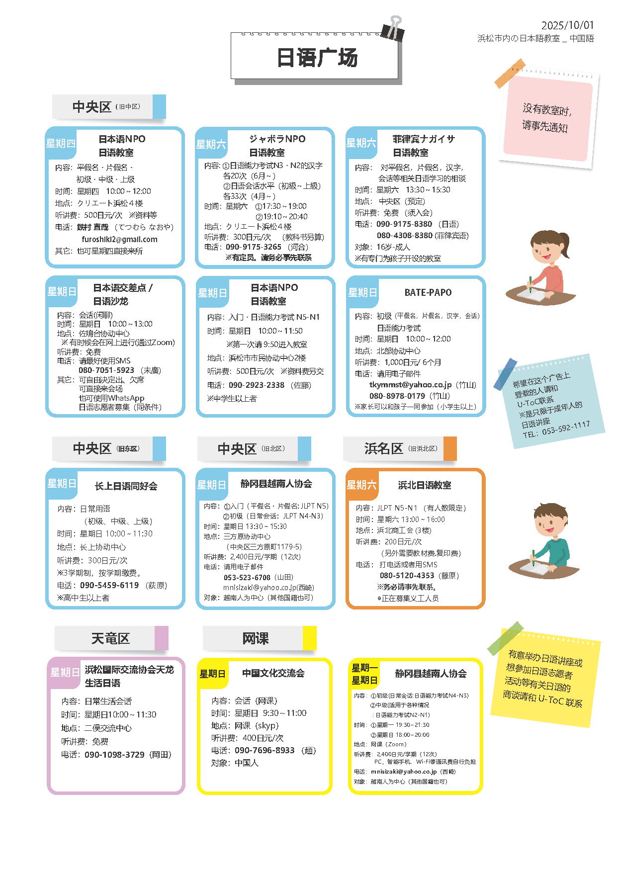 介绍工作及其咨询 日语学习 子女入学 家庭问题等