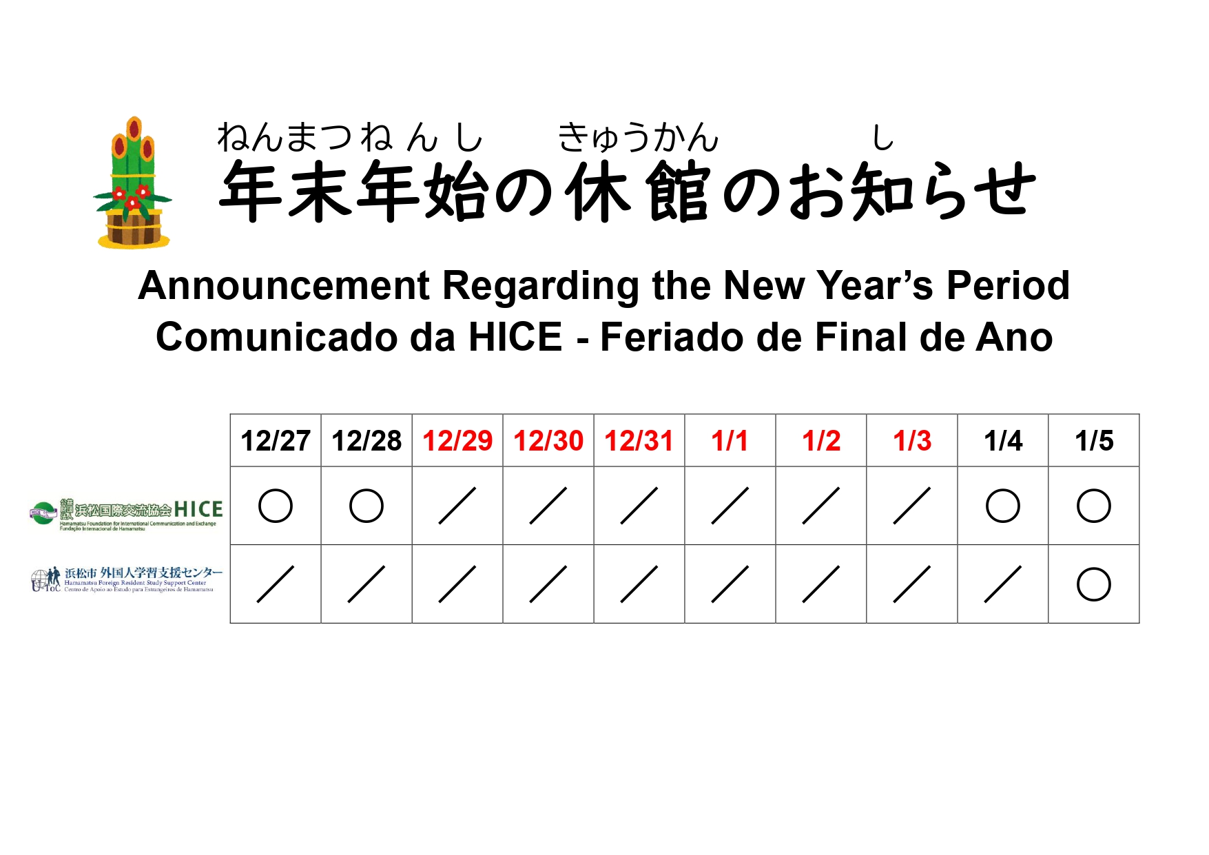 日本語 English Português NewsDecember 26, 2025 (Fri) Check out the other establishments on the city hall website. Share page Copy linkCopied to clipboard Barcode Facebook Twitter LINE Print page 【 Announcement Regarding the New Year’s Period 】 CLOSE < PreviousVolunteers Needed for the 16th… Return to News