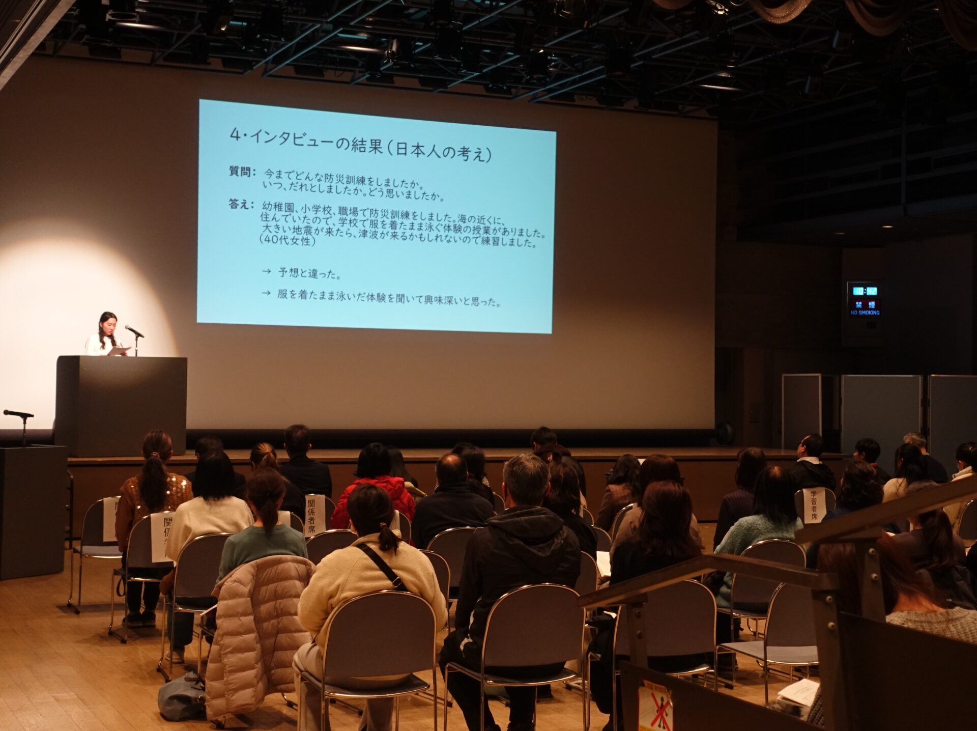 学習者は、自分が興味のあるテーマを決め、日本人・外国人にインタビューし、その結果をレポートにまとめ発表しました。 発表用のスライドや交流会のポスターも学習者自身が用意し、当日の司会・受付も自分達で行いました。