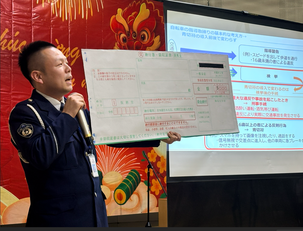 交通ルールについては、2026年4月からの罰則強化や、16歳以上の自転車利用者による違反行為への対応等について、静岡県警察本部交通部交通企画課交通安全教育係の江戸輝巡査部長が説明を行いました。実際の青色切符を拡大して示しながら解説が行われたことで、参加者の関心が高まった様子が見られました。
