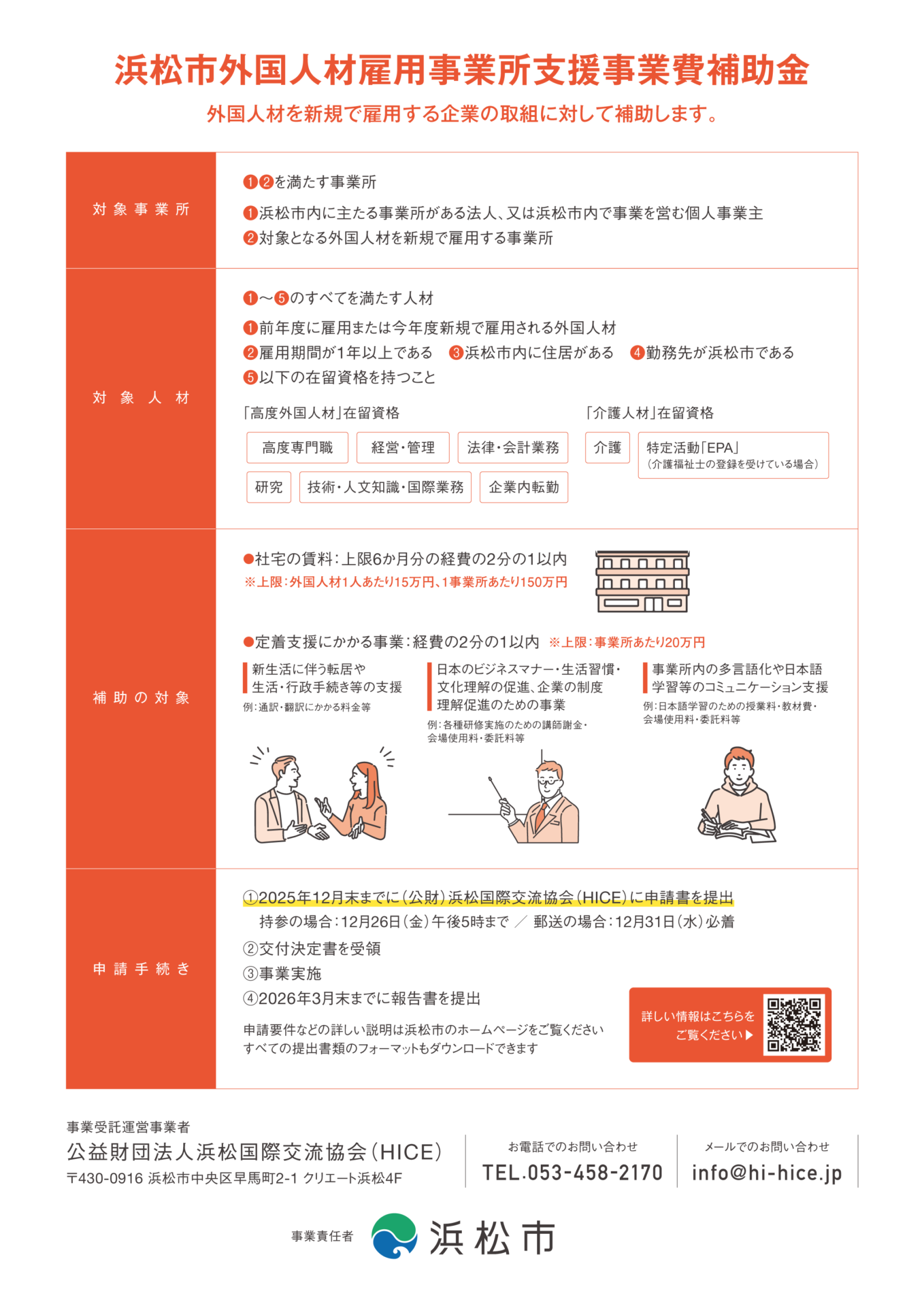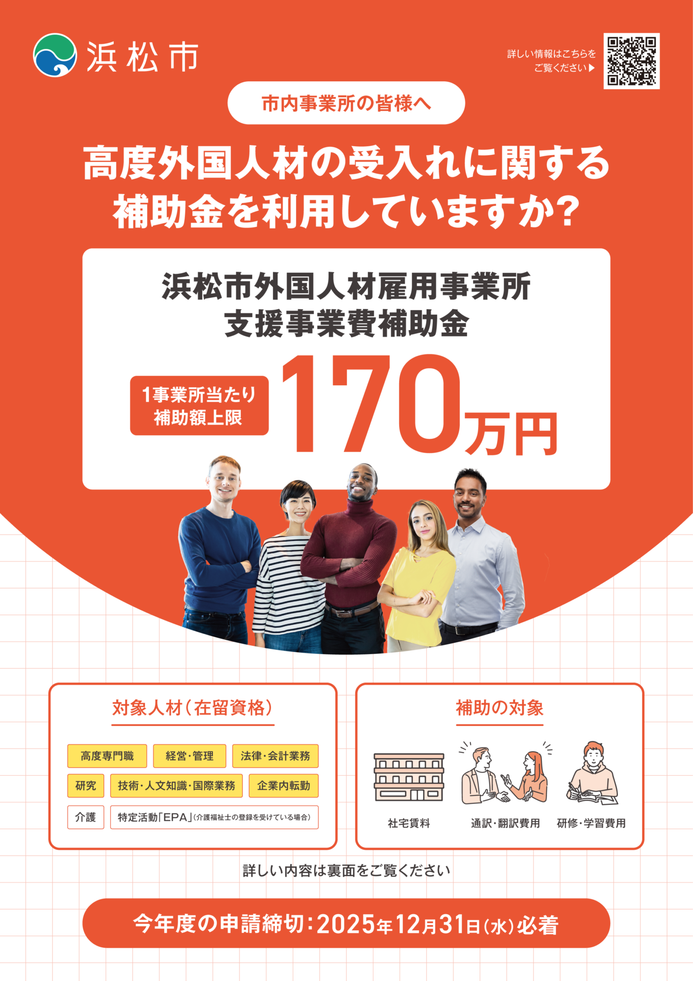 日本語 最新情報2025年10月23日(木) 「浜松市外国人材雇用事業所支援事業費補助金」をご活用ください 浜松市では、外国人材を新規で雇用する企業の取り組みに対して補助します。 募集期間:~令和7年12月31日(金) 必着 応募要項・申請書等の詳細はこちらをご覧ください ページを共有 リンクをコピークリップボードにコピーしました 2次元コード Facebook Twitter LINE ページを印刷 高度外国人材の受入れに関する補助金の締め切りは12月末です。 閉じる < 古い記事10月27日(月)多文化共生センター臨時休館 お知らせへ戻る