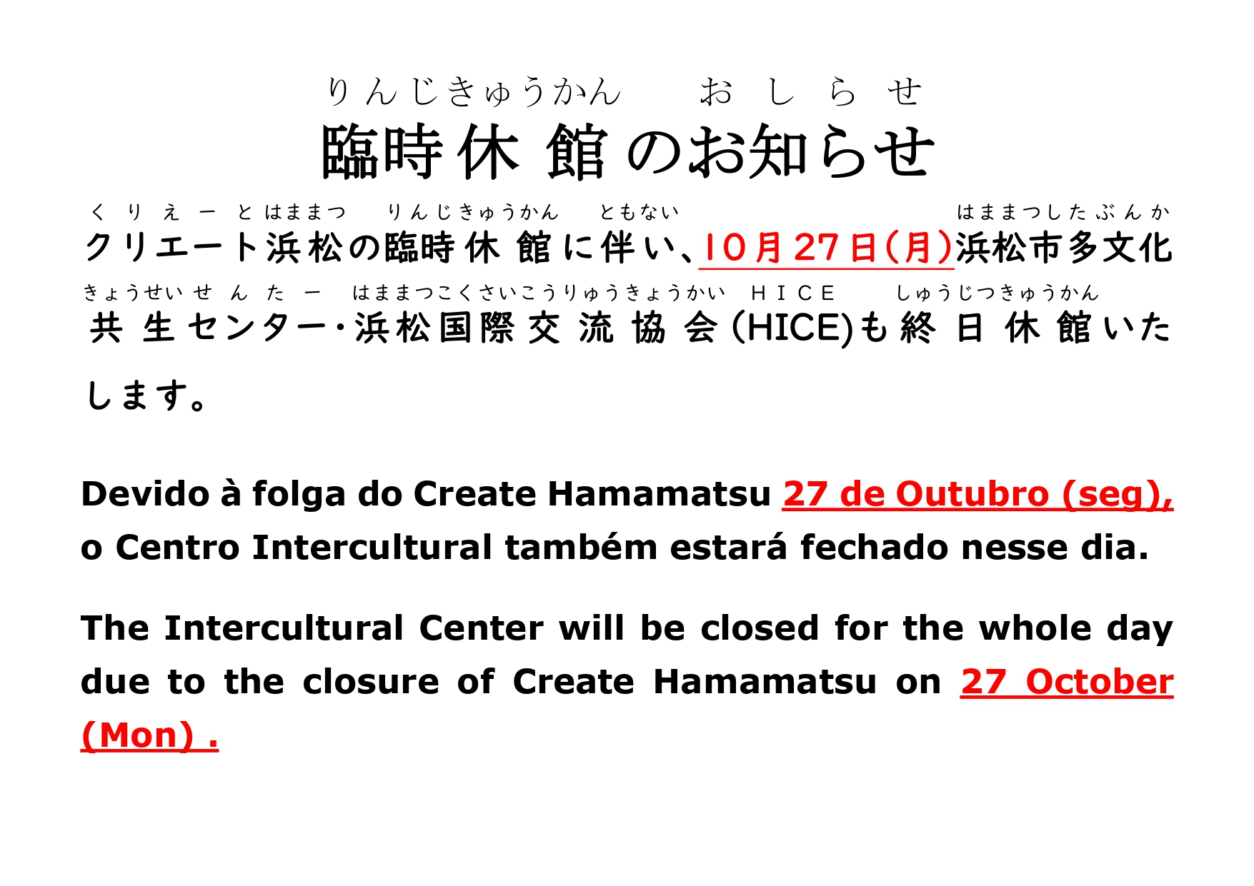 日本語 English Português 最新情報2025年10月13日(月) クリエート浜松の臨時休館日に伴い、4階浜松市多文化共生センター・浜松国際交流協会も休館します。 ページを共有 リンクをコピークリップボードにコピーしました 2次元コード Facebook Twitter LINE ページを印刷 10月27日(月)多文化共生センター臨時休館 閉じる < 古い記事10月は「はままつ多文化共生MONTH」です お知らせへ戻る
