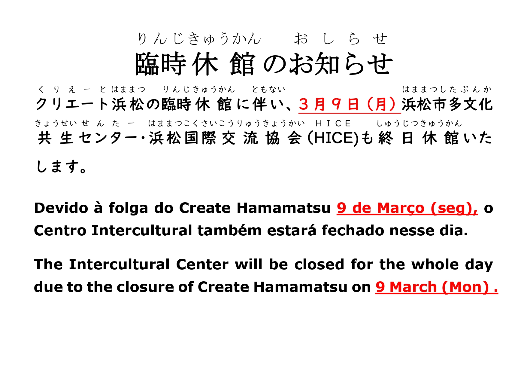 日本語 English Português 最新情報2026年02月23日(月) クリエート浜松の臨時休館日に伴い、4階浜松市多文化共生センター・浜松国際交流協会も休館します。 ページを共有 リンクをコピークリップボードにコピーしました 2次元コード Facebook Twitter LINE ページを印刷 3月9日(月)多文化共生センター臨時休館 閉じる < 古い記事外国人雇用サポート業務に係る事務職員(会計年度・時給)を募集… お知らせへ戻る